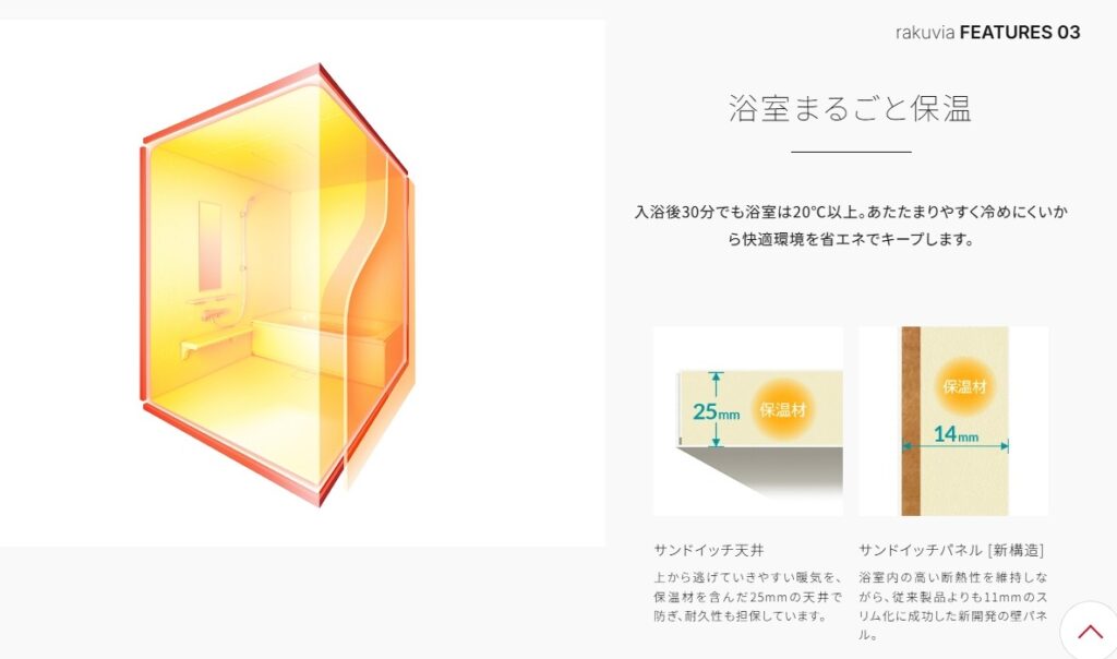なんと、浴室全体が保温材でくるりとパックされています! お湯が冷めにくいのはもちろん、冬場の浴室特有の「ヒヤッ」とした寒さも和らげてくれるんです。追い焚きの回数が減るので、「お財布にやさしい!」のが嬉しいですね。