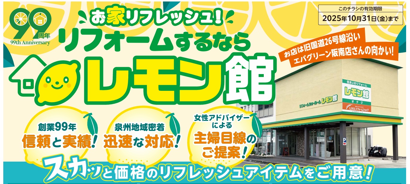 『レモンリフォーム』と、所属する『レモンくらしの木グループ』の情報をあれこれご紹介 スタッフブログ HOMEブログ商品の紹介 2025.10.08 レモン館阪南店エリアのお客様にお得な情報♪ 2025.09.26 阪南店の新商品と、お得情報♪ 2025.09.17 資生堂アートハウスに行ってきました 2025.09.09 LIXILの工場見学に行ってきました♪ 2025.09.01 レモン館阪南店の外壁塗装が完成しました! 2025.08.25 アウトドア用品の収納におすすめのリフォーム 2025.08.04 夏季休暇のお知らせ 2025.07.29 レモン館阪南店外装工事中のお知らせ 2025.07.07 お客さまのリノベーションがもうすぐ完成します★ 2025.06.26 社内研修で台湾を訪れました パートⅡ 123»最後 »
