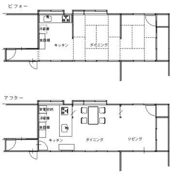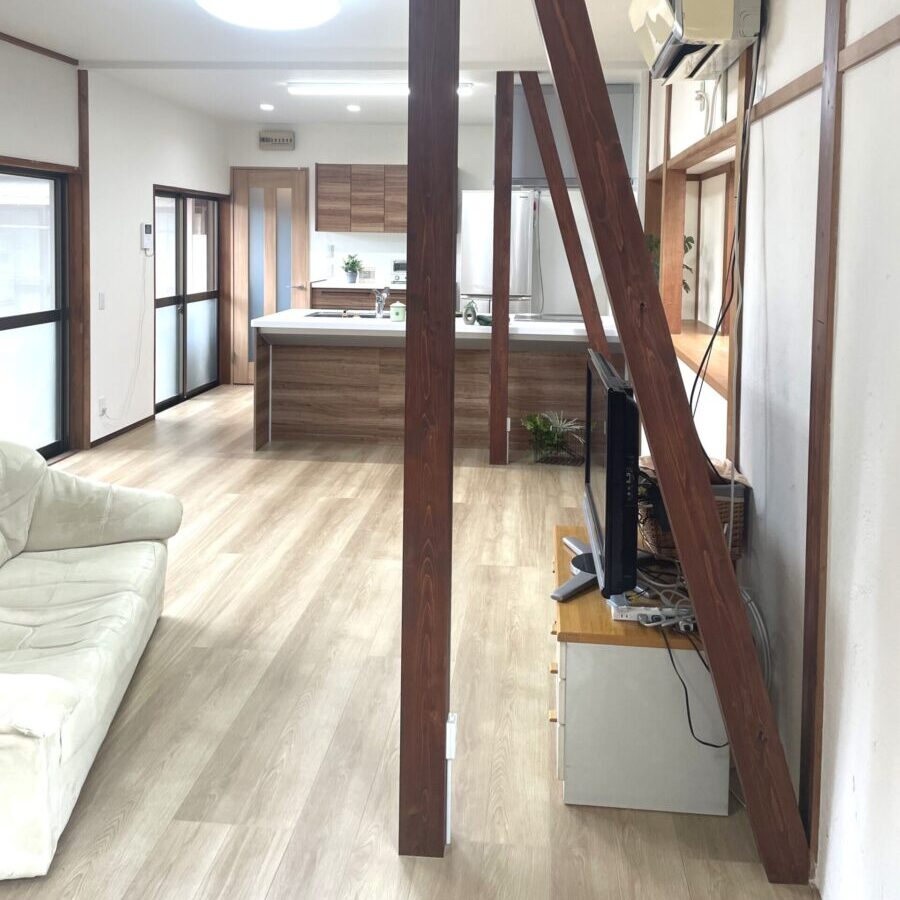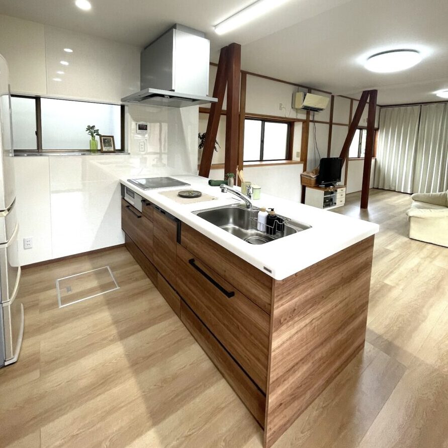 キッチンとダイニングが壁で仕切られていましたが、壁を取り払い大きな一つの空間にしたい、とご相談いただきました。