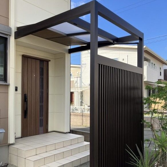 玄関庇がなく雨天時に大変というお悩みがあったので、目隠しとルーフを一体型にできるプラスGと、