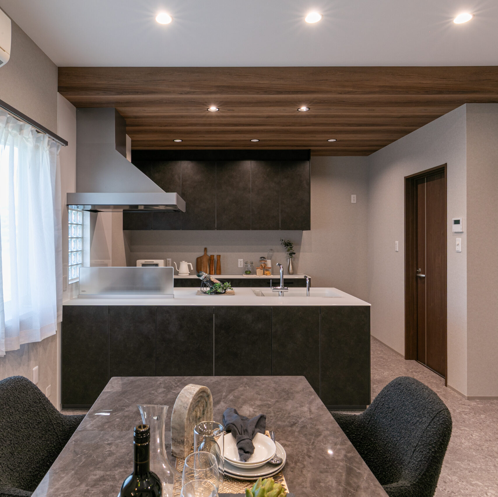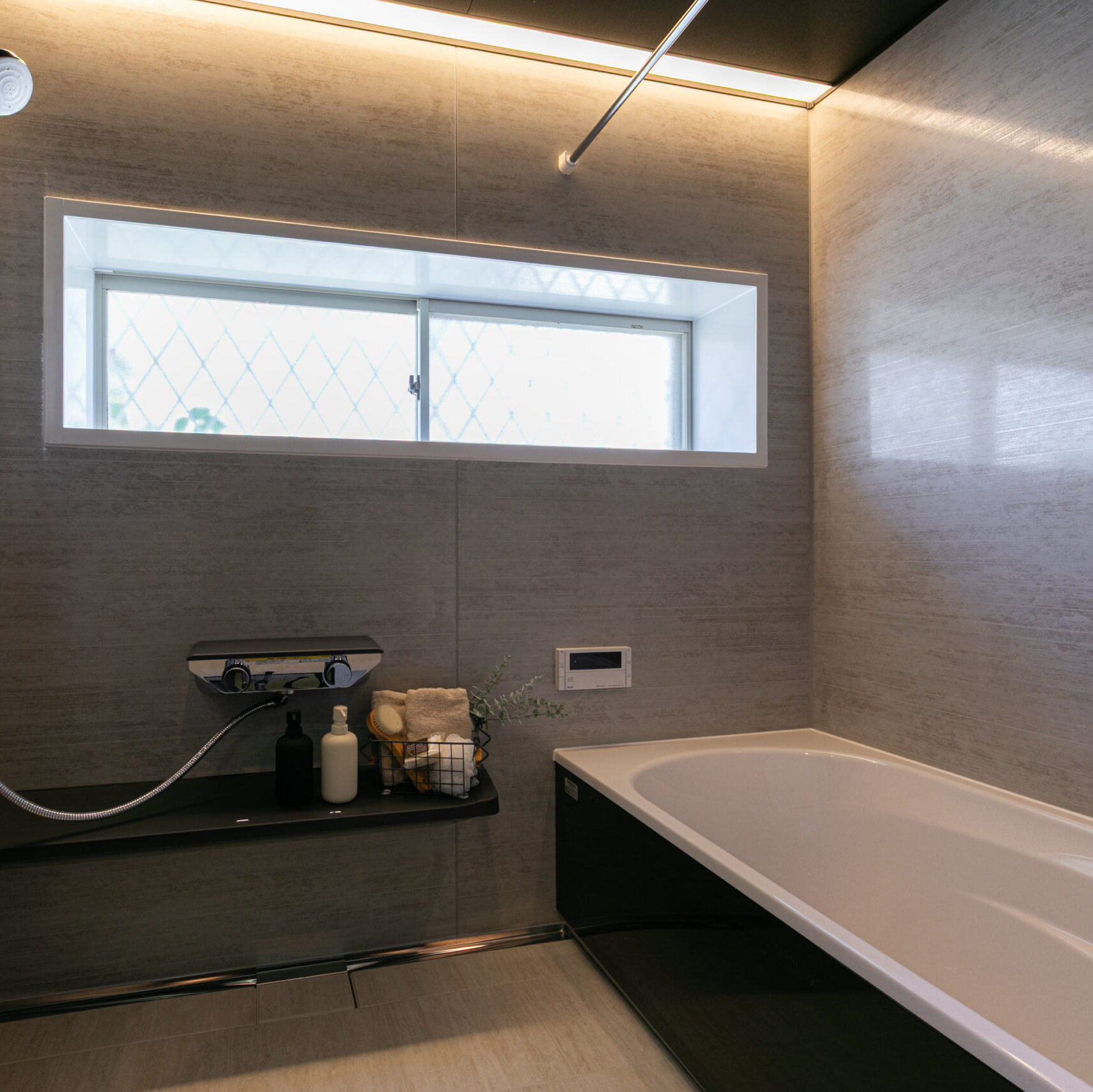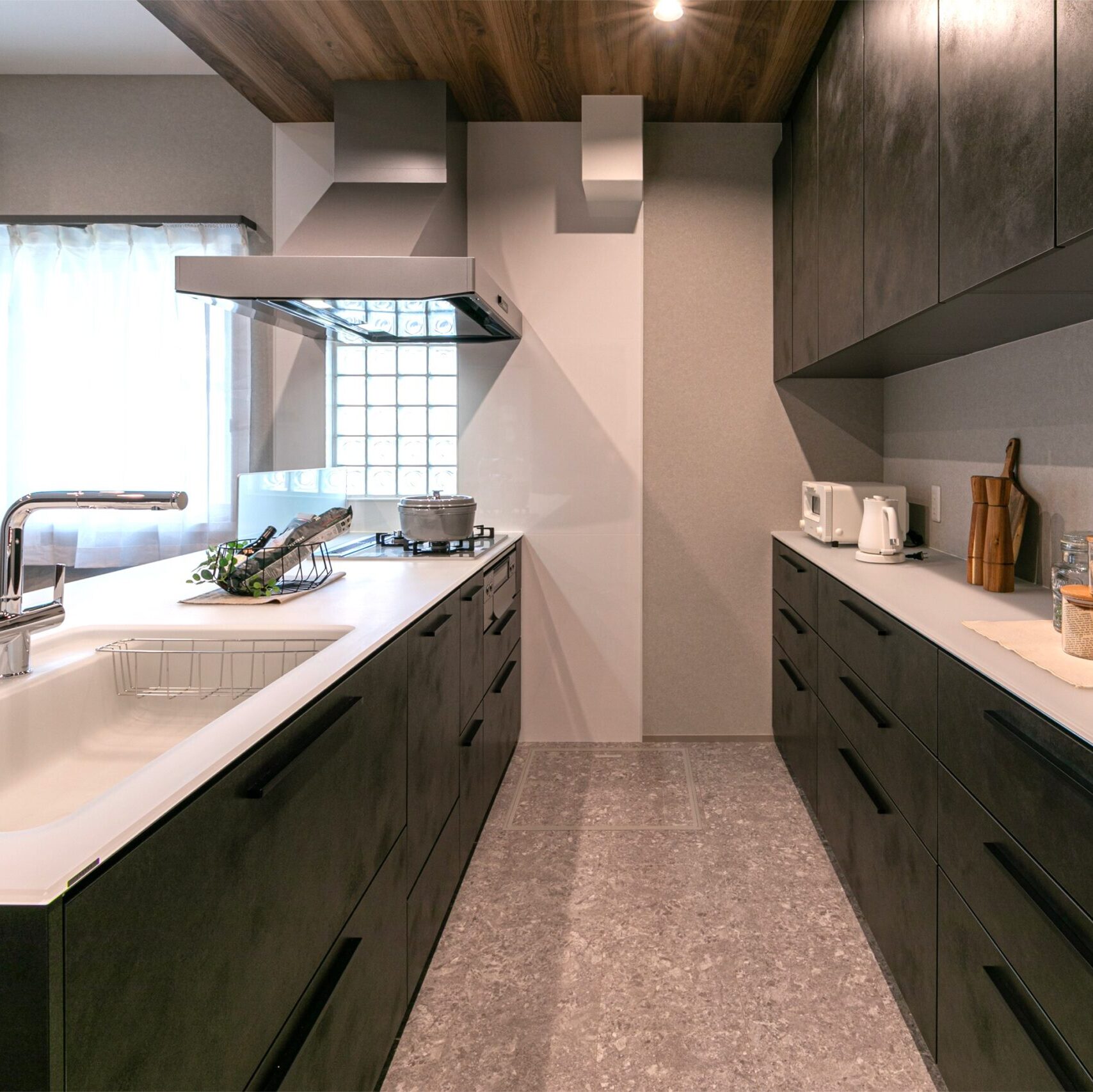 ご実家を譲り受けて住むために水まわりを一新。垂れ壁で囲まれた閉鎖的なキッチンはフラット対面のオープンキッチンへ、タイルの床や壁が冷たかった浴室はあったかいシステムバスへ取替えました。家事に育児にお仕事にとお忙しい奥さまのご希望は、お手入れがしやすく、綺麗をキープできるもの。機能的でデザイン性に優れた商品をご提案し、ダークグレーのモダンな雰囲気で全体をトータルコーディネートしました。