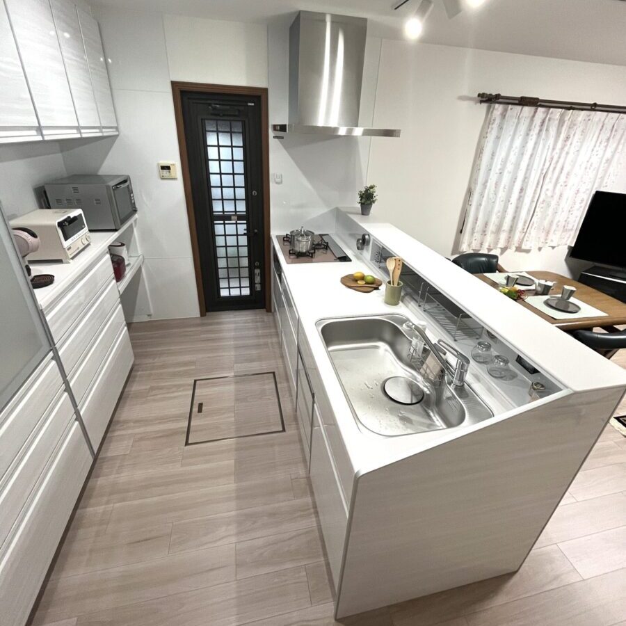 ご採用設備 システムキッチン:タカラスタンダード「トレーシア」 キッチン本体/マルチ収納対面プラン I型オープンタイプ 間口255㎝   背面収納/長さ255㎝       勝手口ドア:LIXIL「リシェントG型」   内窓:LIXIL「インプランス」